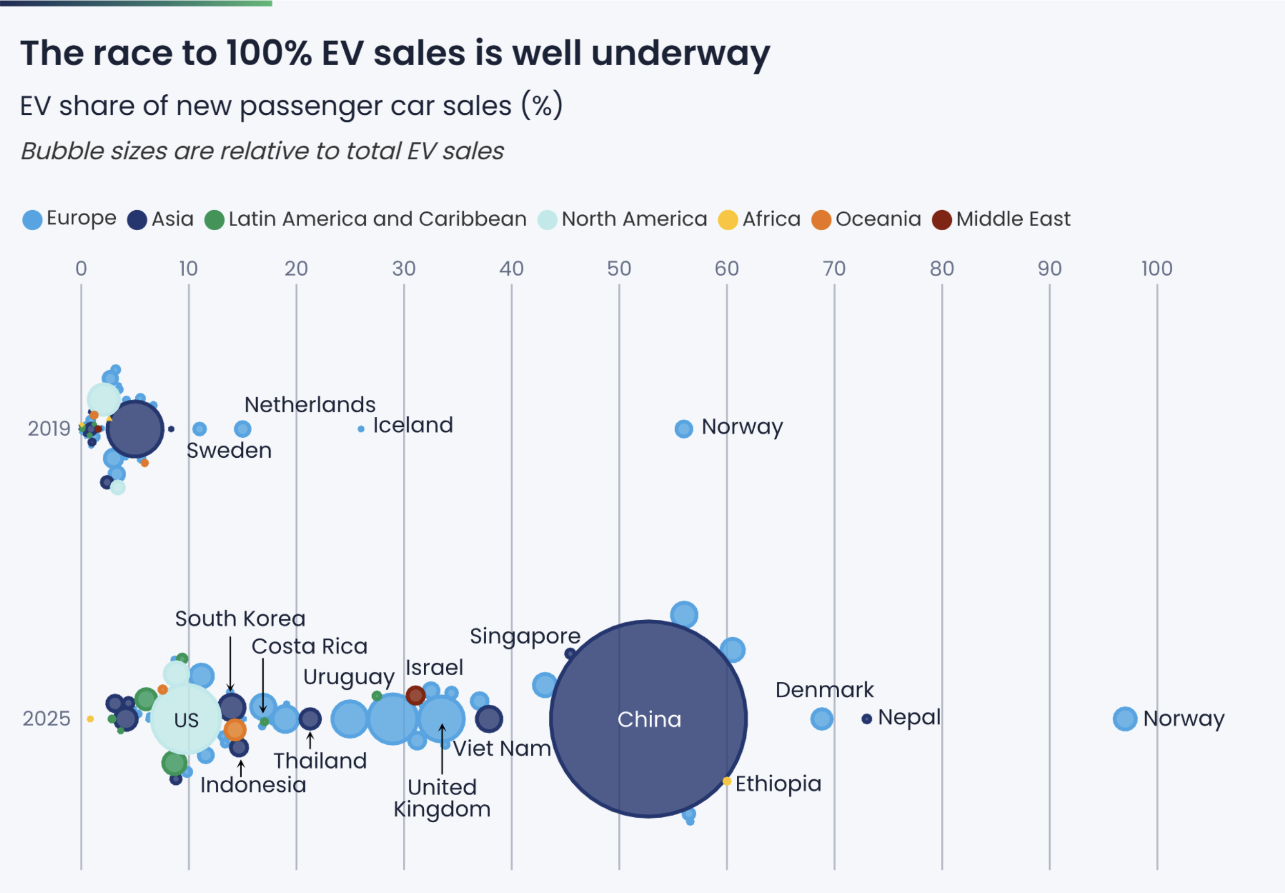 År 2019 hade bara fyra länder – alla i Europa – nått en elbilsandel över 10 procent. I dag har 39 länder passerat den nivån, varav tolv utanför Europa. Kina passerar 50 procent för första gången och står för nära två tredjedelar av all global elbilsförsäljning.
