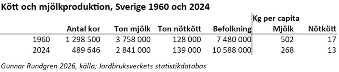 Om vi jämför situationen 2024 med 1960 kan vi se att mjölkproduktionen har minskat kraftigt medan köttproduktionen har ökat litet grand. Per person har mjölkproduktionen halveras och nötköttsproduktionen minskat kraftigt. 1960 var konsumtionen i princip densamma som produktionen.