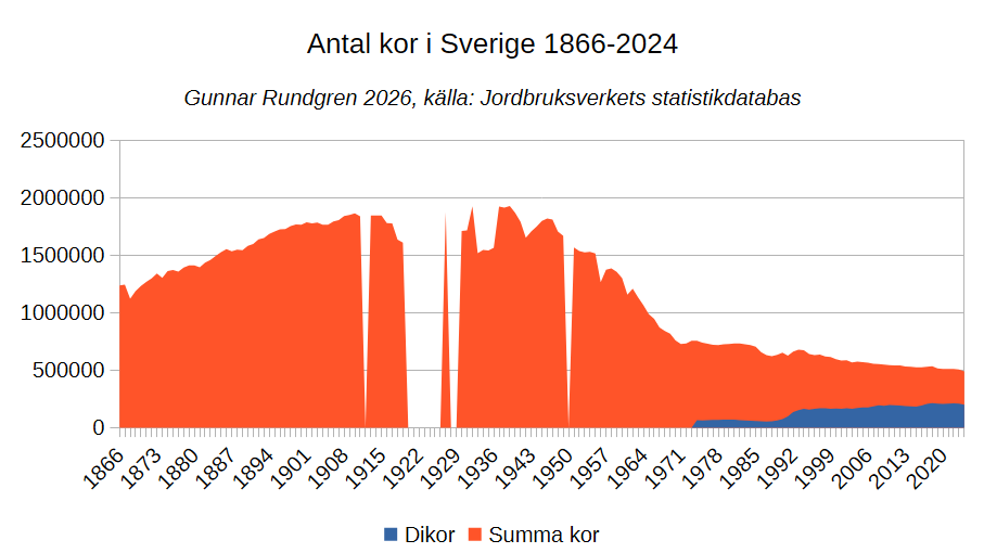 Att hålla dikor var ovanligt fram till 1960-talet, det var mest en del stora gods som höll på med det. Först 1974 började man därför att skilja dem åt i statistiken. År 2024 fanns det 200 000 dikor och 289 000 mjölkkor. Antalet dikor har minskat något sen toppen 2018, men vid slutet av 2024 var det ändå fler dikor än det varit någon gång innan 2017 (det finns inga siffror för slutet av 2025 ännu och även om det gjorde så är det antalet 2024 som påverkar köttproduktionen idag).